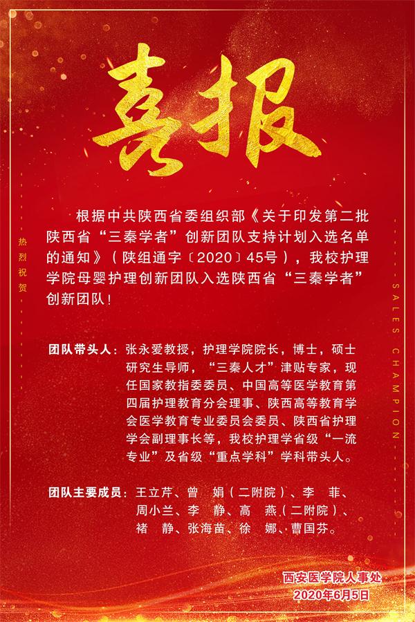 近日,中共陕西省委组织部印发《第二批陕西省“三秦学者”创新团队支持计划入选名单的通知》,以我校护理学院院长张永爱教授为带头人申报的“西安医学院母婴护理创新团队”入选陕西省“三秦学者”创新团队支持计划——“创全省一流团队项目”名单,支持经费100万元。