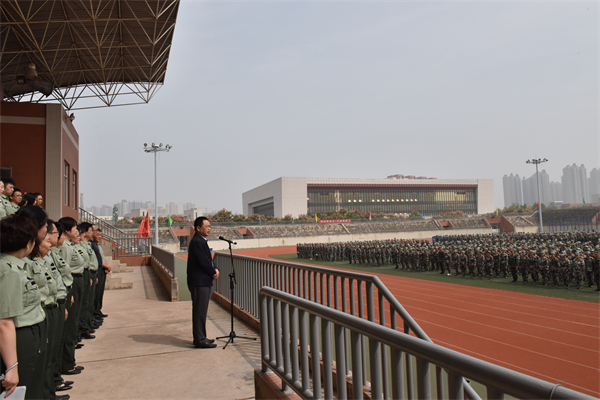 9月24日上午,天朗气清,党委书记刘岭在未央校区体育场看望军训参训学生、承训教官及带队干部。